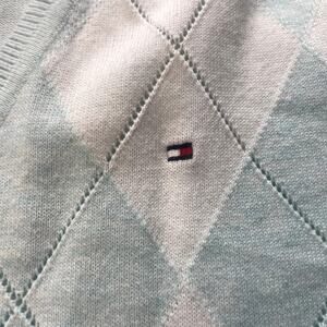 Elevate your wardrobe with this stylish Tommy Hilfiger V-neck sweater. Featuring a classic argyle pattern in white and pale teal, this sweater exudes academia and nerd-core vibes. Perfect for adding a touch of preppy sophistication to any outfit.