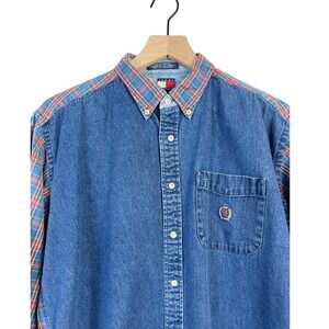 Tommy Hilfiger VTG Denim Plaid Long Sleeve Retro Button Up Shirt Men's XL