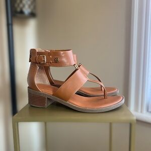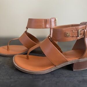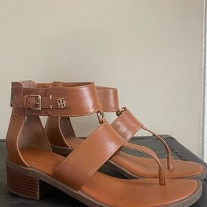 Tan thong T-strap sandals, stacked heel. Ornamental side buckle, heel zipper. TH buckle and flag zipper. Minimal wear, excellent condition, non-slip sole.