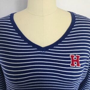 Super stretchy! I love the vintage vibes of this tee. V neck. Has a henley feel to it. Ribbed. Blue and white stripe with red H. Dress it up or down. Perfect for the summer. A really classic Tommy Hilfiger top that will never go out of style.