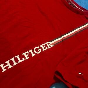 ☆ Features: Rich red cotton t-shirt with vertically printed “HILFIGER” logo on the front alongside the brand’s classic red, white, and navy vertical stripe. Embroidered Tommy Hilfiger flag logo on the sleeve and collar detailing inside.