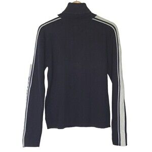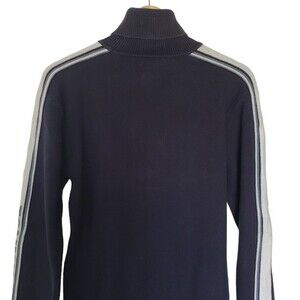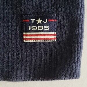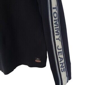 Vintage 80's 90's Tommy Hilfiger turtleneck pullover shirt in a size medium. Navy blue with light blue and white accents, Tommy Jeans Spellout down the sleeve. Listed as a sweater but it's a thick knit, not exactly a sweater. Retro Tommy Hilfiger with the 1985 TJ emblem on the front.