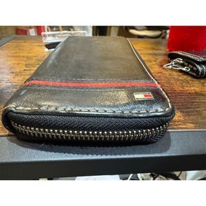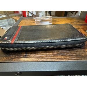 Keywords: Tommy Hilfiger, vintage wallet, leather wallet, unisex wallet, black wallet, zip-around wallet, 90s fashion, credit card holder, solid pattern, logo accent, pre-owned wallet, vintage accessory, formal wallet, casual wallet, timeless style.