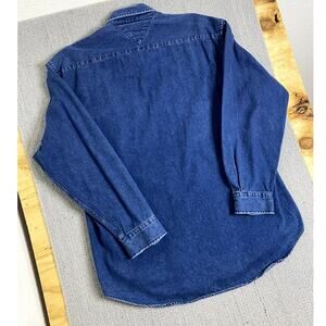 Step up your style game with this awesome Tommy Hilfiger vintage denim shirt! This classic piece features a blue and red checkerboard crest, perfect for adding a preppy touch to any outfit.