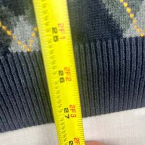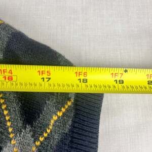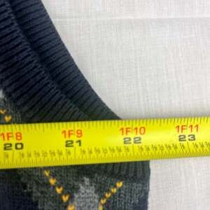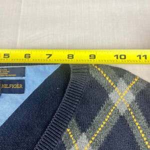 Vintage Tommy Hilfiger Golf sweater vest in excellent pre-owned condition. This men's XL vest features a classic navy blue background with a vibrant argyle pattern in yellow and gray. Made from 100% cotton, it's perfect for a round of golf or adding a touch of preppy style to your everyday look. No stains, rips, or major wear.