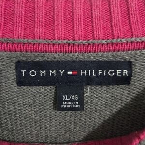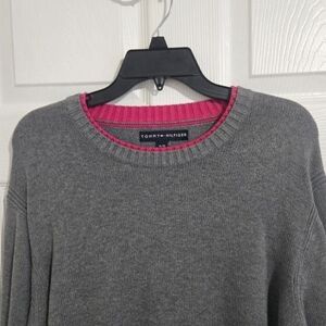 Vintage Tommy Hilfiger knitted sweater. This can be a unisex design. Men's size Large. Women size XL baggy. It's a dark gray color with an pink inner collar area. Long sleeve, crew neck. It has been worn but is overall in good condition.