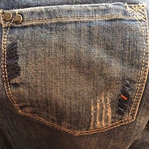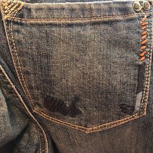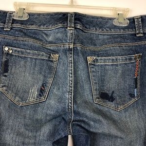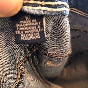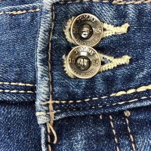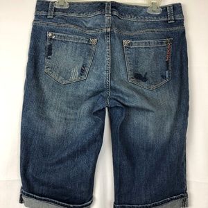 These are vintage Tommy Hilfiger long denim shorts in size 10. They have a double button and stitching on the back pockets. It also has some factory distressing. They are used shorts in great condition.