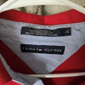 Stylish red polo shirt with classic stripes. Features a button-up collar. Iconic Tommy Hilfiger logo on the chest.