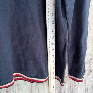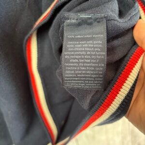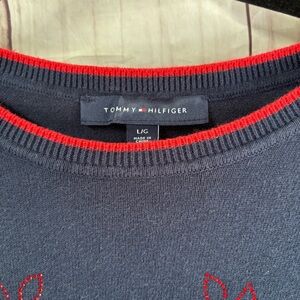 This Tommy Hilfiger long sleeve tee features a striking blue and red color scheme, highlighted by a crew neck with red and white striped trim. The sleeves and hem echo this stylish trim, adding a cohesive touch to the design. A bold graphic design on the front adds a unique flair, making it a standout piece in any wardrobe.