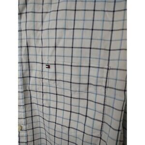 Tommy Hilfiger white blue window pane plaid long sleeve collared button down shirt in good condition. Two button close sleeves. Front logo open pocket