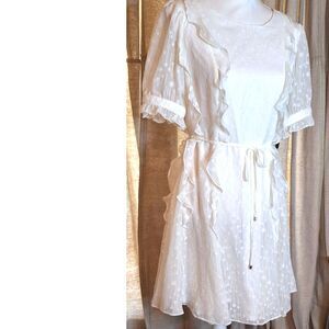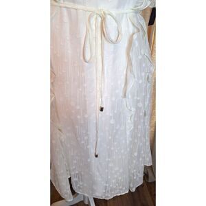 Ruffled trim throughout, textured chiffon overlay, string tie belt at waist.