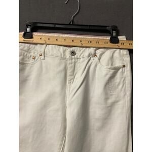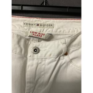 Classic Tommy Hilfiger white denim jeans featuring a low-rise and flared leg design. Signature button closure with belt loops and back pockets.