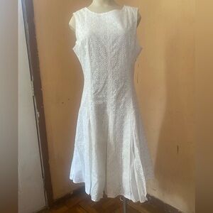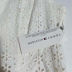 This stunning white dress by Tommy Hilfiger features a strapless neckline and a classic A-line silhouette, perfect for a bride or wedding guest. The intricate lace pattern adds a touch of elegance, while the sleeveless design ensures a sophisticated look for any formal occasion.