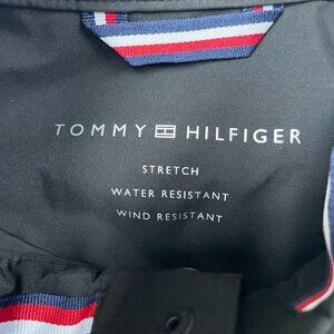 Water-resistant, wind-resistant, lightweight design. Features full zip closure, elastic cuffs, and side pockets. Durable polyester construction with stretch for comfort and mobility. Classic Tommy Hilfiger stripe detail.