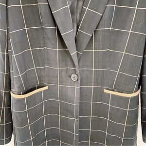 -Window pane patterned long blazer with elbow patches
