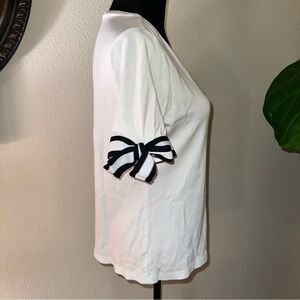 Contrasting navy blue and white tie accents at each sleeve lends a charming touch to this 100% cotton top by Tommy Hilfiger. In excellent condition!! No holes or stains. In Size: Large. Tommy Logo Left Chest Side. ***Models wearing similar tops***