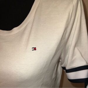 Tommy Hilfiger Women’s 100% White Cotton Navy Blue Tie Accent at Each Sleeve L