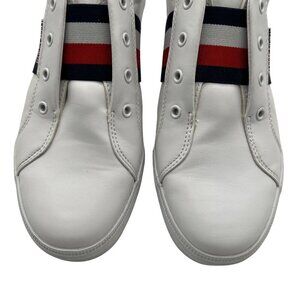 white sneakers red navy stripes casual footwear size 9.5M Tommy Hilfiger shoes man-made upper womens casual shoes white slip-ons womens white shoes Tommy Hilfiger sneakers womens slip-on shoes white fashion sneakers Tommy Hilfiger casual