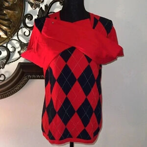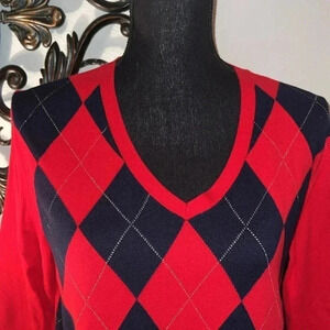 Tommy Hilfiger Women’s Argyle Red Navy with Silver accent. 100% Cotton, V-Neck Sweater Jumper Pullover. Size: Large. In EXCELLENT condition! No holes or stains.