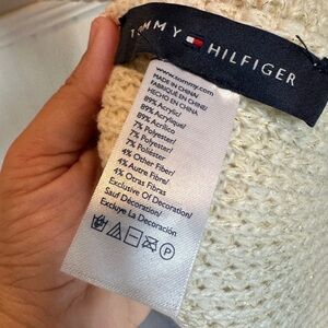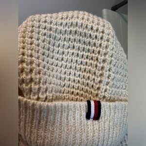 Tommy Hilfiger Women's Beige & Gold Knit Beanie Hat Cap & Scarf Flag Logo. 5 Feet long and 9” wide. It’s out of the box but it’s new, never worn.