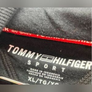 Stylish black sweatshirt with bold Tommy Hilfiger logo. Pair with Tommy Hilfiger sleek black leggings. Perfect for casual wear.