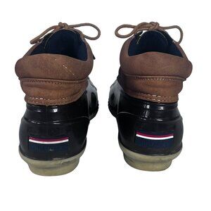 Designed for the modern man, these Tommy Hilfiger duck shoes offer both style and practicality. Featuring a waterproof rubber exterior and durable leather upper, they're ideal for wet conditions. The brown and black color combination provides a classic look, ensuring versatility in any wardrobe.