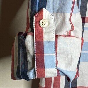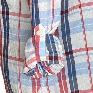 This button-up shirt offers a professional yet casual look, featuring a classic plaid pattern in red, blue, and white. Its lightweight design and collared style provide both comfort and versatility for daily wear.