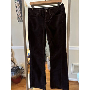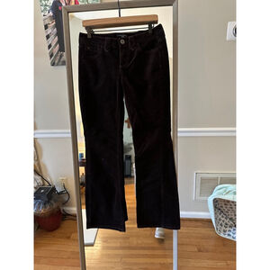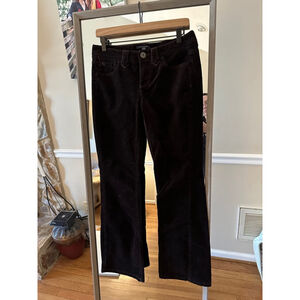 These are pre-owned Tommy Hilfiger corduroy pants in a dark brown color. They feature a standard five-pocket design with a button and zipper closure. The pants have a bootcut leg opening. The material shows some signs of wear, particularly around the seams and pockets, with slight fading and creasing visible. The size is marked as 6. No significant damage or stains are observed.