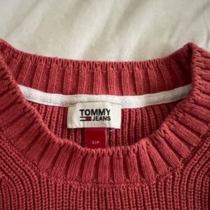 Relaxed Fit Crewneck Sweater by Tommy, petite small, Mineral Red, 60% Cotton, 40% Acrylic, armpit to armpit 24”, sleeve length 20”, length 20”, sits at waist. Some photos taken from online, last three are of the item for sale.