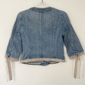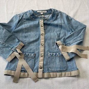 Snap button 3/4 length jacket with a cream ribbon accent. There are small ties on the jacket sleeve.