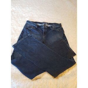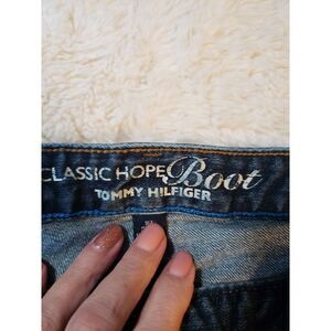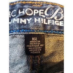 This is Tommy Hilfiger Womens Denim Jeans Blue 16L Classic Hope Boot Pockets High Rise. 98% Cotton, 2% Spandex. Machine Washable.