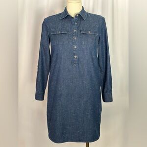Tommy Hilfiger dress is made of blue denim fabric and features long sleeves with buttoned cuffs, a collared neckline, and a button-down front. The dress has two chest pockets with button closures and a straight hemline. Casual everyday style dress.