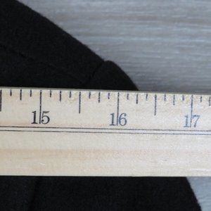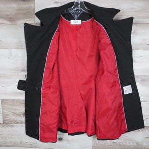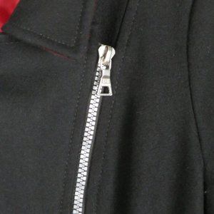 Pre-Owned, Excellent Condition! Blended Wool. Gorgeous Logo Zipper Front Closure/Pockets Glide with Ease. All Black Shell with Bright Red Lining. Oversized Turtle Shell Metal Buttons.