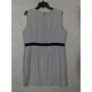 Tommy Hilfiger dress, women's clothing, geometric print, navy accents, polyester blend, size 16 dress, sleeveless dress, elegant dress, modern style, zipper closure, decorative buttons, , sophisticated dress, comfortable wear