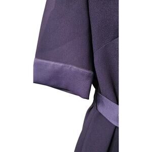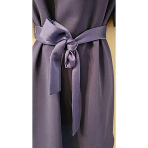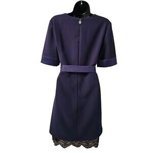 This is a show stopping navy blue A-line dress by Tommy Hilfiger, made of 100% polyester fabric with a black eyelash lace hem. It has a crew neckline, 3/4 sleeves, and a zip closure. It has a beautiful satin belt that matches the trim on the sleeve. The dress is size 6 (tags have been removed, but it's mine so I know it's a 6) and has a modern theme, suitable for travel, party/cocktail, casual, formal, and business occasions. It is machine washable and lined, with a dress length above the knee. The dress is not vintage and was made in China.