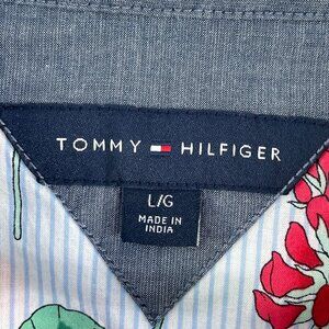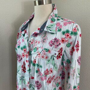 Tommy Hilfiger Womens Large Floral Button Up Shirt Stripe Roll Tab Sleeve Blouse