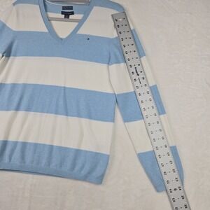 Tommy Hilfiger Women's Light Blue and White Striped V Neck Sweater Size Large