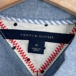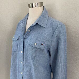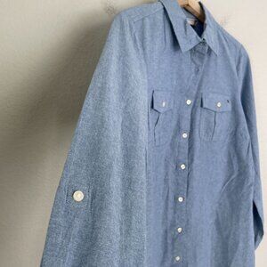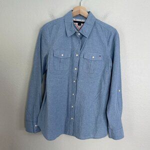 Tommy Hilfiger Womens Medium Light Blue Cotton Button Up Shirt Roll Tab Sleeve