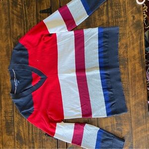 Stay stylish with this Tommy Hilfiger men's sweater featuring bold red, white, and blue stripes. Perfect for any casual occasion.