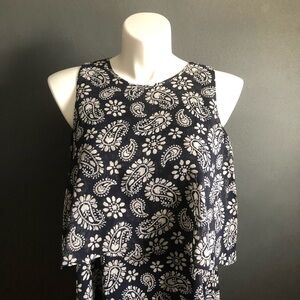 FEATURES: Navy blue chiffon dress with paisley print throughout. Dress is layered, sleeveless, lined and back button closure.