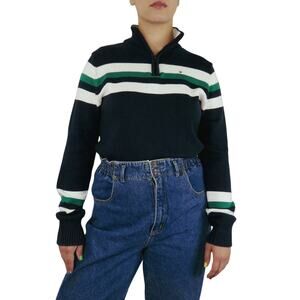 Vintage Tommy Hilfiger Navy & Green Striped Quarter Zip Knit Pullover Sweater