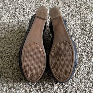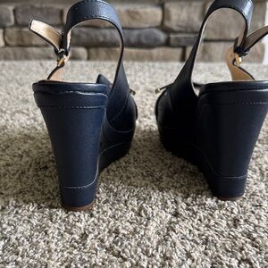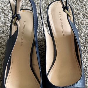 Tommy Hilfiger Chic navy wedges with slingback design. Features a stylish peep-toe. Ideal for casual or dressy looks.