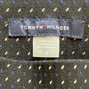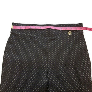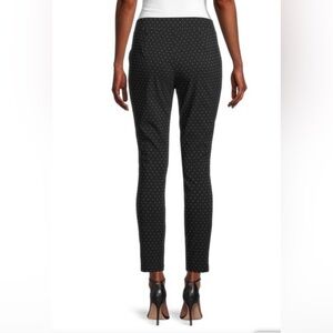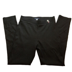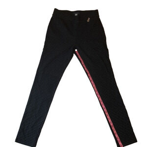 These pants are classy and adorable. They are stretchy black, pull-on pants with blue in the pattern.