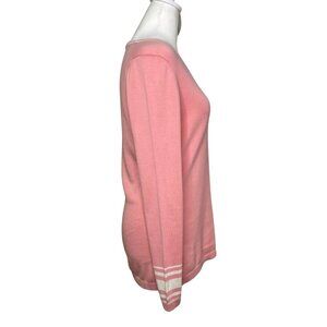 Crafted with the timeless elegance that Tommy Hilfiger is renowned for, this women's pink sweater is a versatile addition to any wardrobe. Its classic striped design, paired with a stylish V-neck and cuffed sleeves, offers a blend of comfort and sophistication suitable for various occasions, from casual outings to business meetings or even travel. The knit fabric, composed of breathable cotton, ensures a comfortable fit with a lightweight feel, perfect for the transitioning seasons of fall, spring, and winter. Attention to detail is evident in the sweater's construction, featuring a tight-knit weave and a regular fit that complements the figure without restriction. Its machine-washable nature makes for easy care, allowing this piece to remain a staple in your collection. The pullover style embodies the designer's colorful and classic theme that speaks to the essence of the brand. The garment was made in Bangladesh and is machine washable. It is 100% cotton, comfortable, and breathable. Its measurements are as follow: shoulder to hem, 25"; pit to pit, 36"; sleeves, 23."