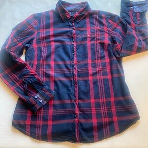 Chic plaid button-down shirts. Features navy and pink patterns. Ideal for casual outings. 18” pit to pit 25” length
