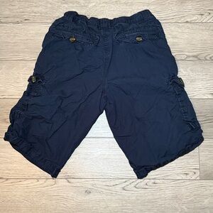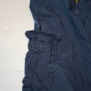 Classic navy cargo shorts with tan waistband. Ideal for everyday comfort with multiple pockets.