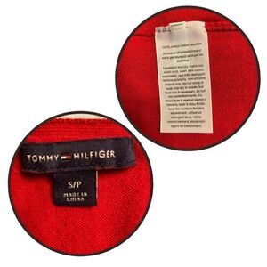 Elevate your wardrobe with this stunning Tommy Hilfiger red V-neck pullover sweater. The collarless and asymmetrical sleeve design adds a touch of elegance to any casual or dressy occasion. The solid pattern with intricate beading on the front creates a unique, sophisticated look. Made with 100% cotton and a tight-knit style, this lightweight sweater is perfect for all seasons and features stretchy fabric for optimal comfort. The logo on the left lower sleeve is a subtle yet stylish touch. It's a perfect fit for petite sizes and machine washable for easy care. Get ready to turn heads with this gorgeous sweater from the Tommy Hilfiger product line. Pre-owned.