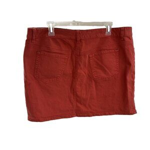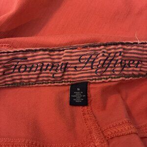 Gently used. Women’s Tommy Hilfiger red denim skirt size 16, five pocket, zipper/button closure, stretch, no material or care tag. Measurements laying flat: length 16 inches, waist 19 inches.
