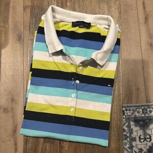 From the site: "Tommy Hilfiger's striped polo shirt brings together classic American style and with a relaxed, sporty New Millenium look. Lightweight cotton materials make for a shirt that can be worn year-round, no matter the temperature; bright vibrant colours make this a versatile piece, able to pair with pants or a skirt as part of a preppy look or a ranchier vibe. Shirt has fitted sides and enough length to tuck in or leave untucked