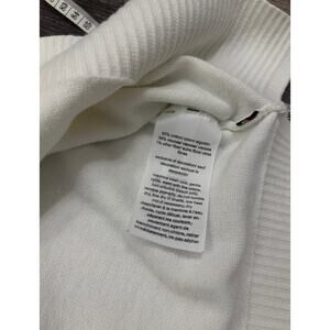 This is a stylish women's V-neck sweater by Tommy Hilfiger, featuring bold striped sleeves in vibrant colors. The sweater is designed for casual wear, offering both comfort and a touch of elegance. It is a size large.